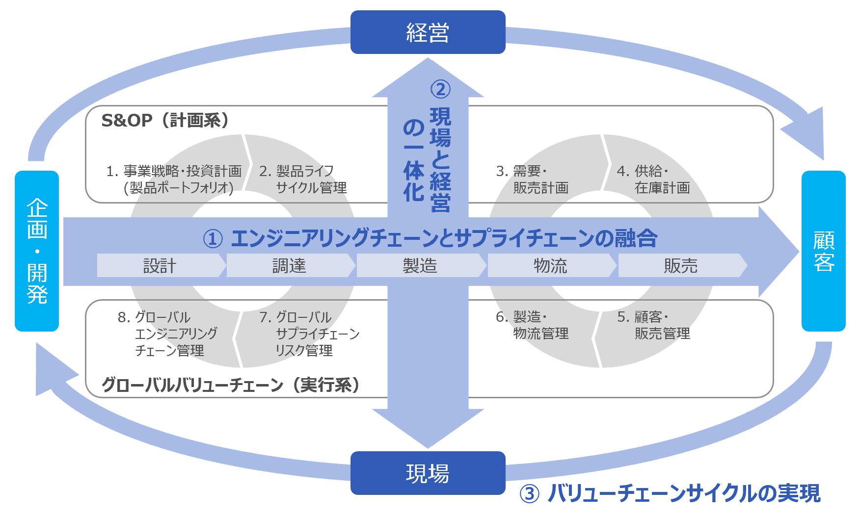 具体的には、事業・製品ポートフォリオや開発投資の最適化といった経営判断を起点に、PLMやERPを中核としつつ各種SaaSソリューションを組み合わせたデジタル基盤を再設計することで、①エンジニアリングチェーンとサプライチェーンの融合、②現場と経営の一体化、③バリューチェーンサイクルの実現を達成するとともに、製品別・事業別の収益構造や開発・生産の進捗、リスクを経営と現場が同一のデータに基づいて把握可能とし、不確実性の高い市場環境においても迅速かつ的確な意思決定を可能とします。